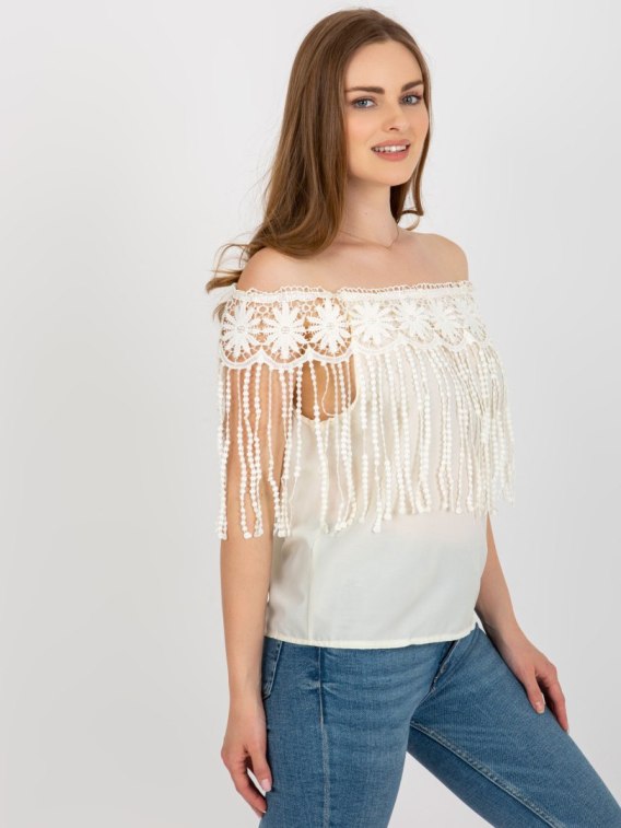 Jasnobeżowa letnia bluzka hiszpanka z koronką .