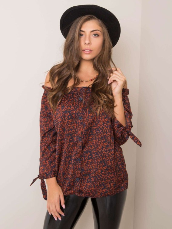 SUBLEVEL Granatowo-brązowa bluzka hiszpanka w kwiatki.