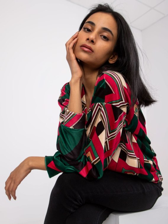 Wymiary bluzki w rozmiarze one size mierzone na płasko: szerokość pod pachami - 55 cm, długość całkowita - 65 cm, długość rękawa - 58 cm.