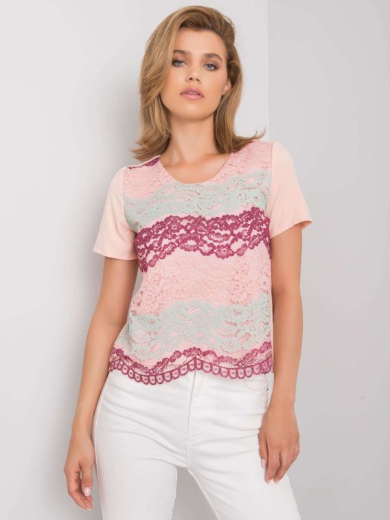 Brzoskwiniowo-bordowa bluzka koronkowa.