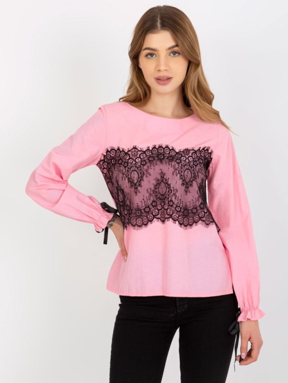 Jasnofioletowa bluzka wizytowa z koronką i wiązaniem .