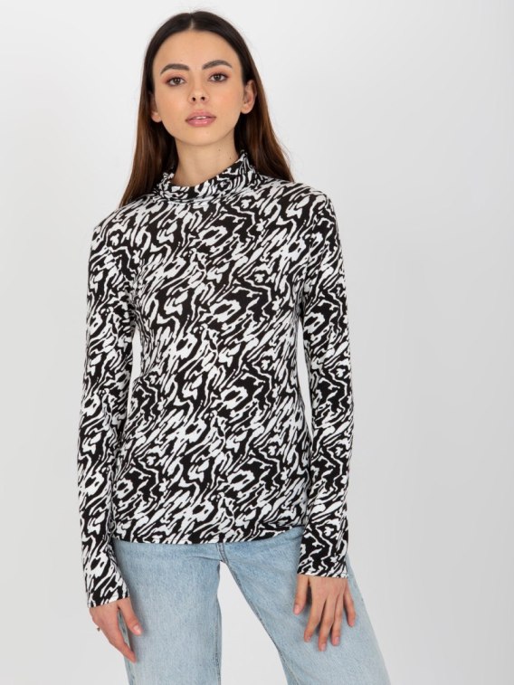 Biało-czarna dopasowana bluzka z golfem i nadrukiem .