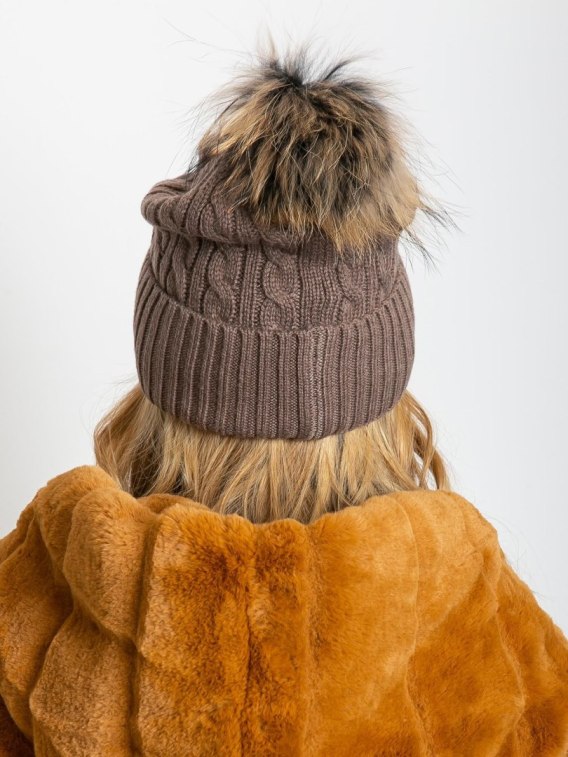 Czapka z warkoczowym splotem i futrzanym pomponem ciemnobeżowa