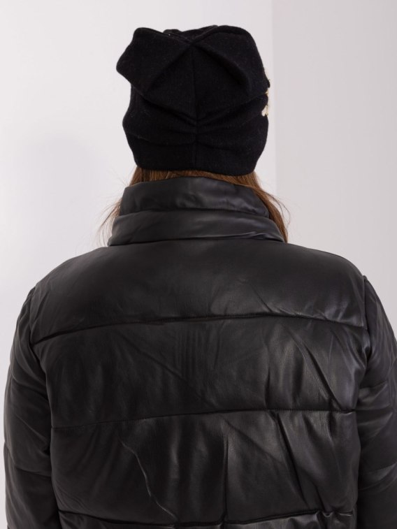 Czarno-beżowa dzianinowa czapka z aplikacją i cyrkoniami.