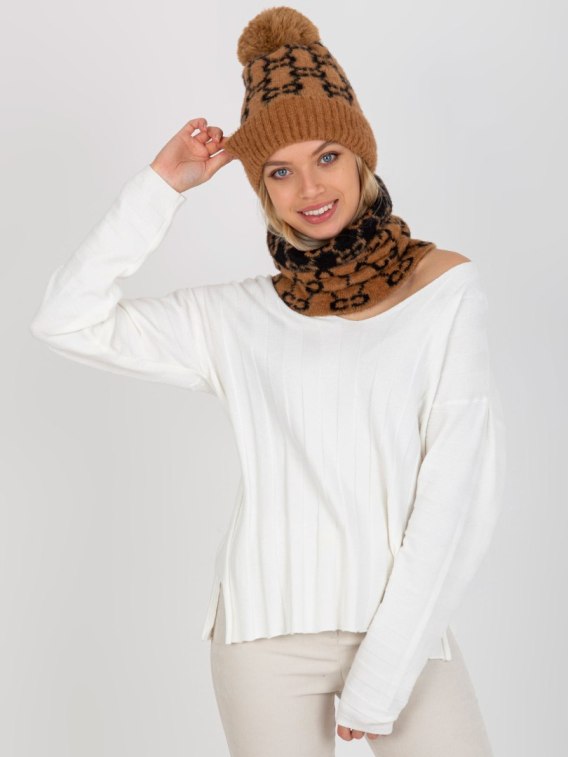 Czarno-camelowa damska czapka zimowa we wzory .