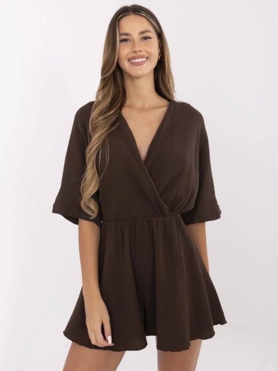 Wymiary kombinezonu w rozmiarze one size mierzone na płasko: szerokość pod pachami - 50 cm, długość rękawa - 45 cm, szerokość w talii - 30 cm (na płasko), szerokość w talii - 63 cm ( po rozciągnięciu), szerokość w biodrach - 54 cm, długość całkowita - 87 cm.