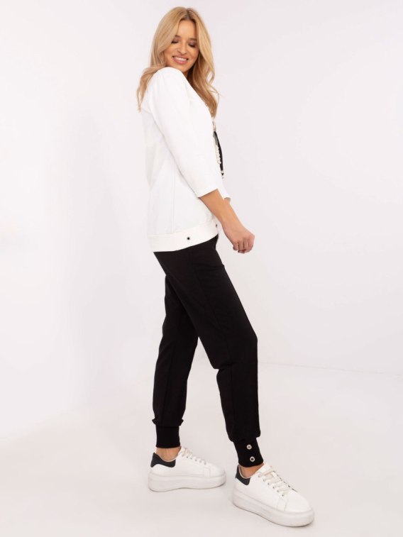 Wymiary kompletu w rozmiarze S mierzone na płasko: szerokość pod pachami - 50 cm, długość bluzy - 68 cm (przód), długość bluzy - 72 cm (tył), długość rękawa - 44,5 cm (od szwu), szerokość spodni w pasie - 34 cm, długość spodni - 99 cm.
