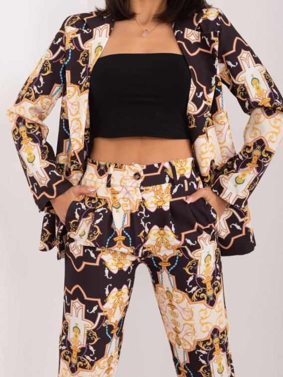 Wymiary kompletu w rozmiarze S mierzone na płasko: szerokość marynarki pod pachami - 48 cm, długość rękawa - 57 cm, długość marynarki - 66 cm, szerokość spodni w pasie- 31 cm, wysokość stanu - 29 cm, długość spodni- 97 cm .