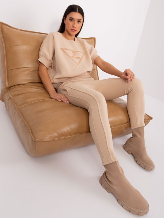 Wymiary kompletu w rozmiarze one size mierzone na płasko: szerokość bluzy pod pachami - 72 cm, długość bluzy - 56 cm, szerokość spodni w pasie - 38 cm, wysokość stanu - 34 cm, długość spodni - 97 cm.