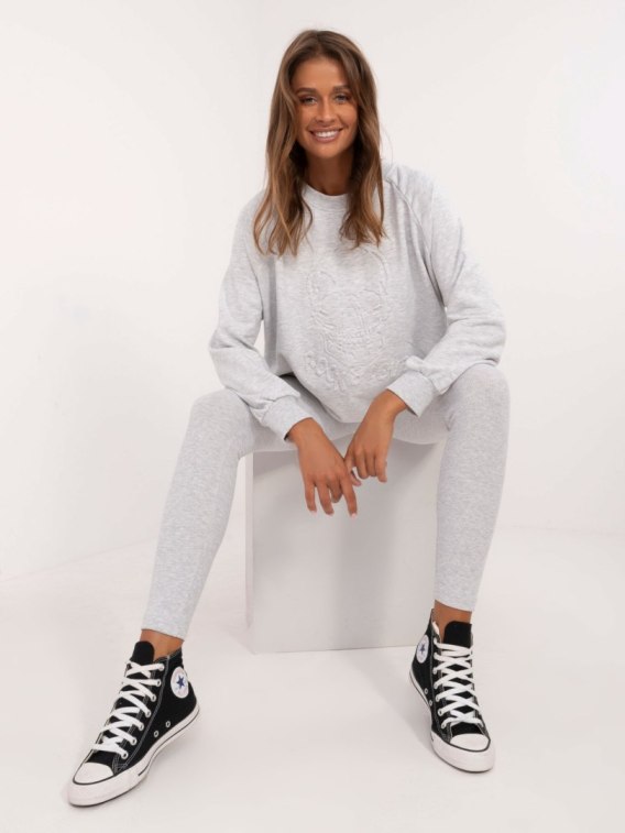 Wymiary kompletu w rozmiarze one size mierzone na płasko: szerokość bluzy pod pachami - 70 cm, długość bluzy - 74 cm, długość rękawa - 64 cm, szerokość legginsów w pasie - 30 cm, wysokość stanu - 28 cm, długość legginsów - 98 cm.