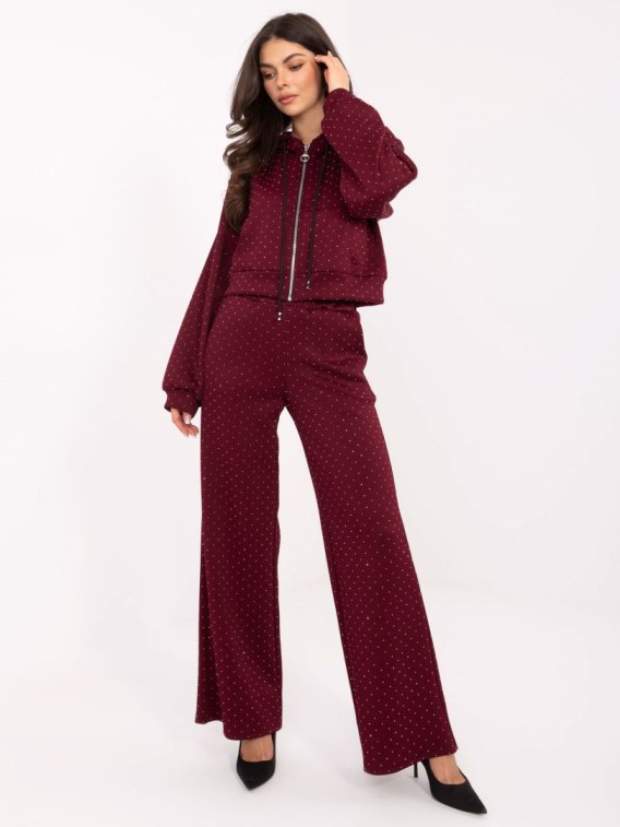 Wymiary kompletu w rozmiarze one size : szerokość pod pachami - 56 cm, długość bluzy - 48 cm, długość rękawa - 58 cm (od szwu), szerokość w biodrach - 52 cm, szerokość spodni w pasie - 33 cm (na płasko), szerokość spodni w pasie - 62 cm (po rozciągnięciu), szerokość w biodrach - 51 cm, długość spodni - 106 cm.