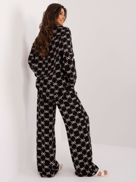 Wymiary kompletu w rozmiarze S/M mierzone na płasko: szerokość koszuli pod pachami - 62 cm, długość rękawa - 65 cm, długość koszuli (przód) - 68 cm, długość koszuli (tył) - 77 cm, szerokość spodni w pasie - 34 cm, wysokość stanu - 34 cm, długość spodni - 113 cm.