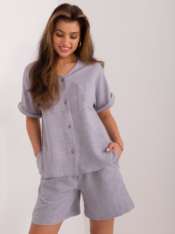 Wymiary kompletu w rozmiarze S/M mierzone na płasko: szerokość bluzki pod pachami - 63 cm, długość bluzki - 65 cm, szerokość szortów w pasie - 31 cm, wysokość stanu - 32 cm, długość szortów - 45 cm.