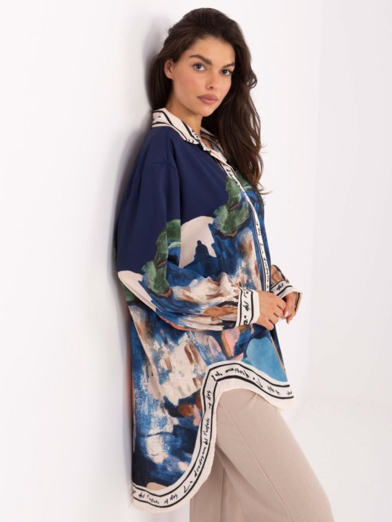 Wymiary koszuli w rozmiarze one size mierzone na płasko: szerokość pod pachami - 78 cm, długość rękawa - 55 cm (od szwu), szerokość w biodrach - 78 cm, długość całkowita - 78 cm (przód), długość całkowita - 101 cm (tył) .