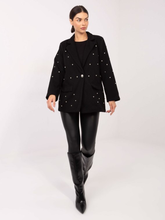 Wymiary marynarki w rozmiarze one size mierzone na płasko: szerokość pod pachami - 54 cm, długość rękawa - 59 cm, szerokość w biodrach - 58 cm, długość całkowita - 74 cm.