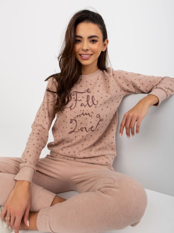 Beżowa ciepła piżama ze spodniami i bluzą .