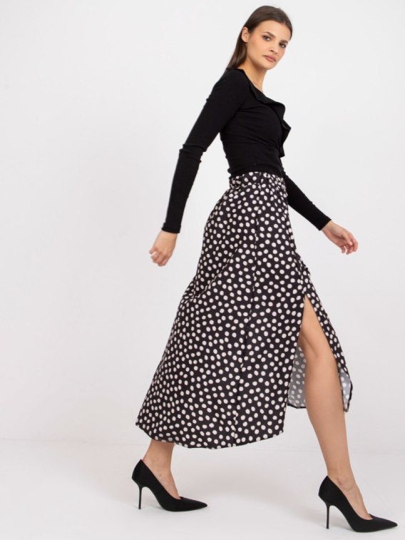 Wymiary spódnicy w rozmiarze S mierzone na płasko: szerokość w pasie - 35 cm, długość całkowita (przód) - 78 cm, długość całkowita (tył) - 89 cm.