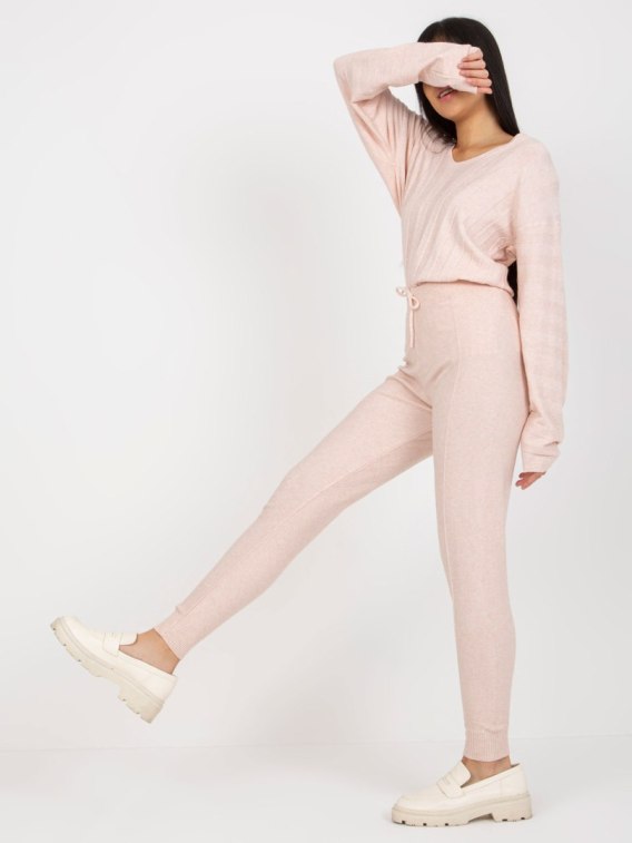 Jasnoróżowe damskie spodnie dzianinowe z wiązaniem .