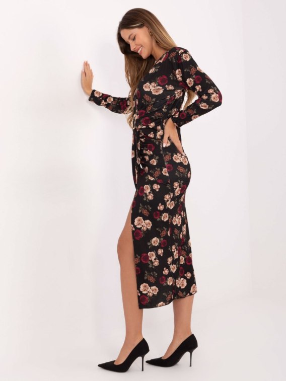Wymiary sukienki w rozmiarze one size: szerokość pod pachami - 54 cm, szerokość w talii - 32 cm, długość rękawa - 56 cm, szerokość w biodrach - 46 cm, długość całkowita - 138 cm.