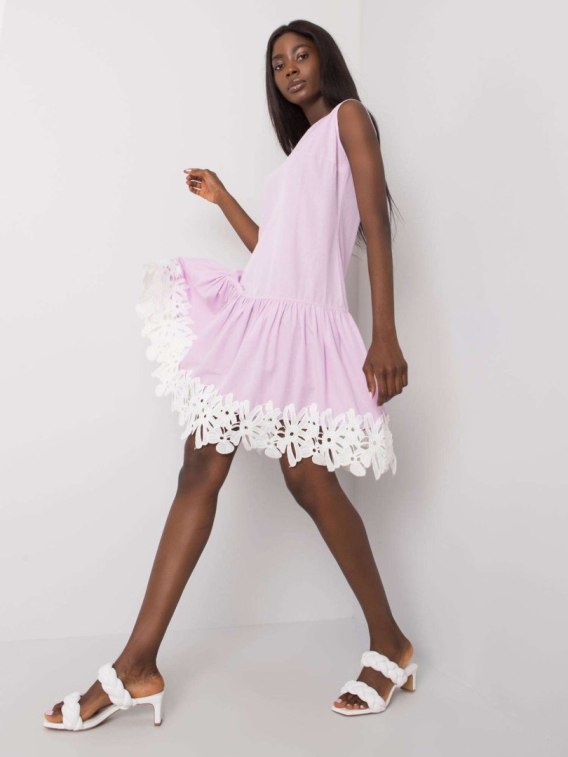 Jasnofioletowa sukienka damska z ozdobnym wykończeniem.