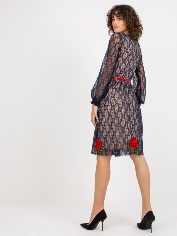 Granatowa koronkowa sukienka koktajlowa z naszywkami .