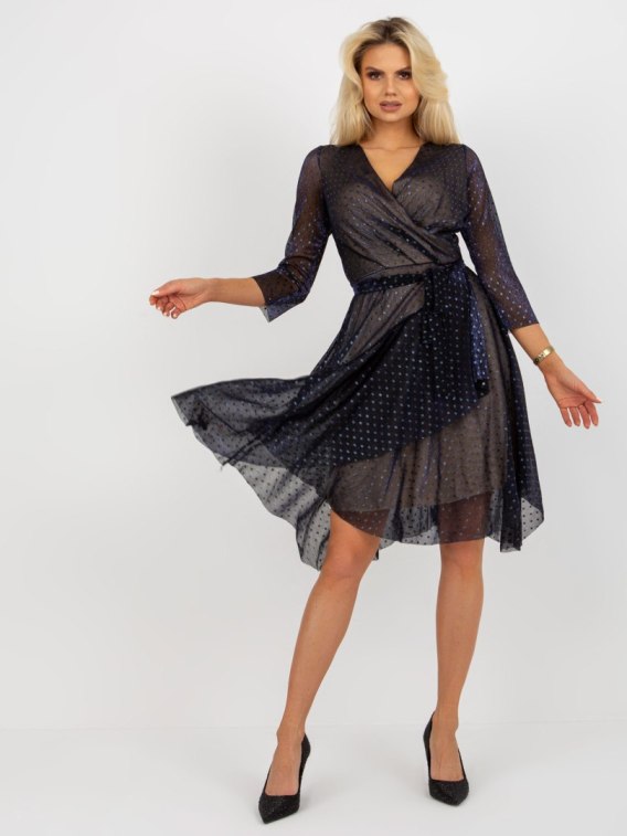 Granatowa kopertowa sukienka koktajlowa w kropki .