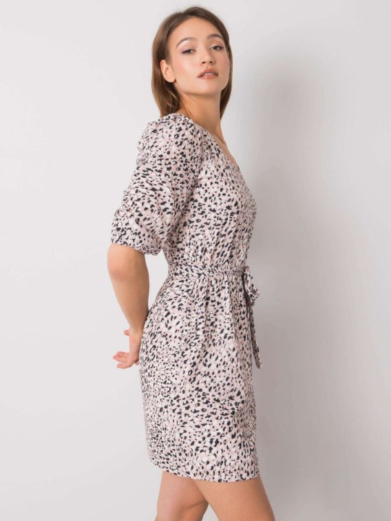 Brudnoróżowa wzorzysta sukienka z paskiem.