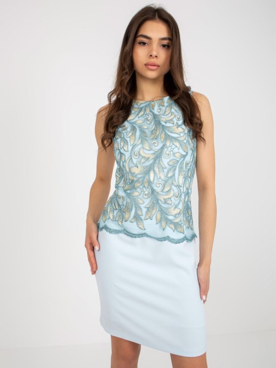 Jasnoniebieska sukienka koktajlowa z ozdobną górą.