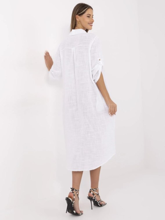 Wymiary sukienki w rozmiarze one size mierzone na płasko: szerokość pod pachami - 62 cm, szerokość w talii - 62 cm, długość rękawa - 41 cm, szerokość w biodrach - 67 cm, długość całkowita - 113 cm.
