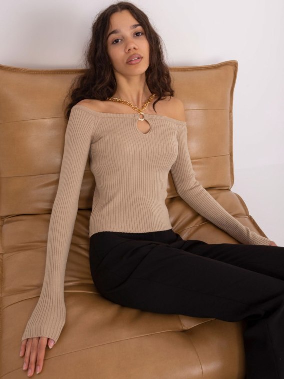 Beżowy sweter z odkrytymi ramionami i łańcuszkami.